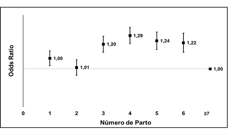 Figure 2. Odds ratio (with 95% confidence intervals) for the occurrence of foot injuries taking into consideration the calving number. Costa Rica. Period 1990-2015.