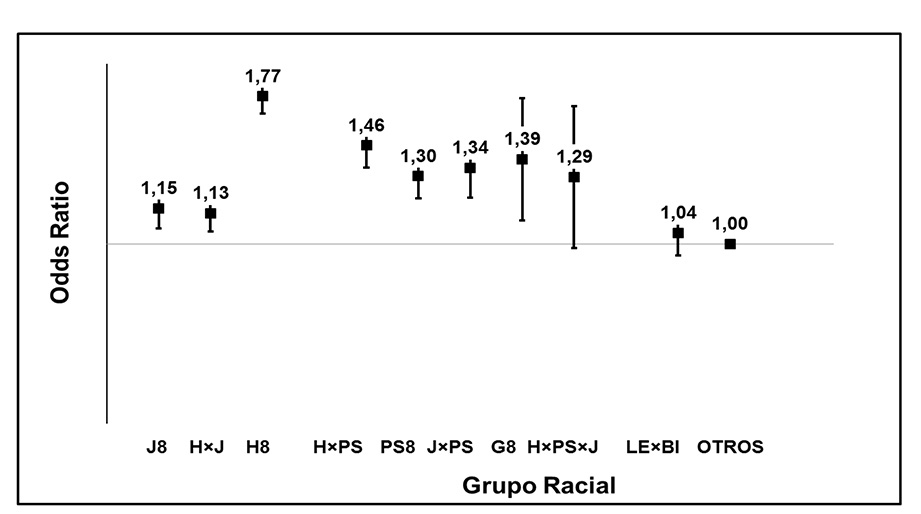 En cuanto al factor racial, el grupo más propenso a sufrir lesiones podales fue la raza Holstein, mientras que los grupos menos propensos fueron los conformados por cruces entre razas lecheras y Bos indicus, y otros grupos raciales heterogéneos (Figura 3). Entre las dos razas lecheras más comunes en Costa Rica, se observó que la Holstein presentó una marcada mayor propensión que la Jersey. Se observó además que el OR del grupo Holstein×Jersey fue similar al de Jersey, lo que sugiere un efecto marcado de heterosis para este rasgo, es decir, la propensión a LP del cruce es mucho menor que el promedio de las razas paternas. El porcentaje de heterosis basado en los OR sería de 22,6% [(1,13-1,46)/1,46]. En el caso del cruce Holstein×Pardo Suizo este efecto también fue favorable, pero menos marcado, con un estimado de heterosis de 5%.