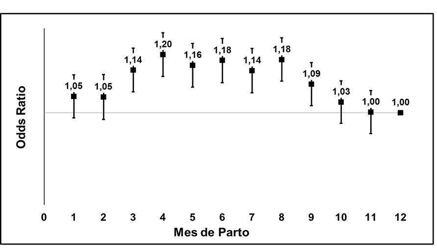 Figure 4. Odds ratio (with 95% confidence intervals) for the occurrence of foot injuries taking into consideration the calving month. Costa Rica. Period 1990-2015.