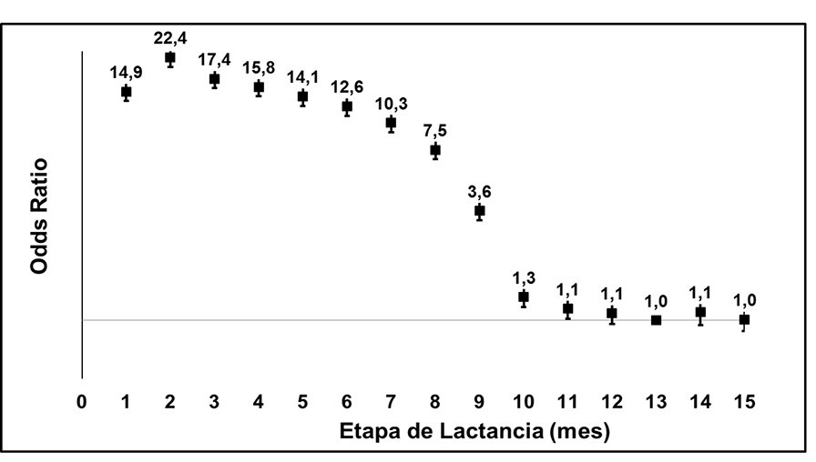 Se determinó que las vacas que parieron en los meses comprendidos entre marzo y agosto presentaron mayor propensión a LP (Figura 4), con estimados de OR cercanos a 1,20. Por el contrario, los meses de parto donde la propensión fue menor fueron noviembre y diciembre.