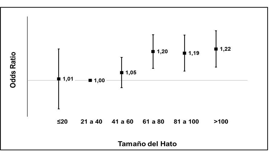 Figure 7. Odds ratio (with 95% confidence intervals) for the occurrence of foot injuries taking into consideration the herd size. Costa Rica. Period 1990-2015.