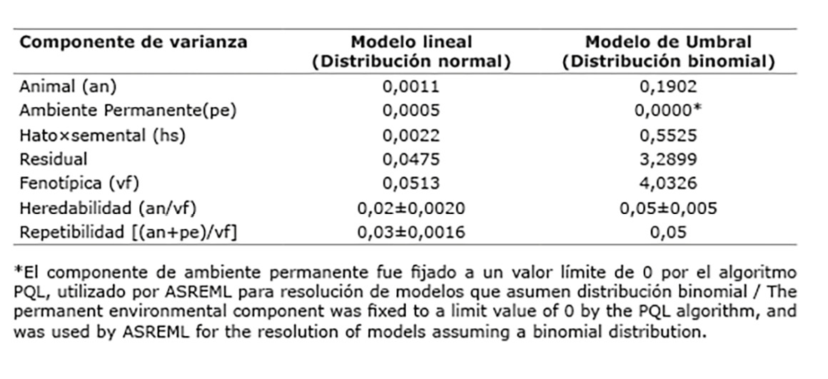 Table 1. Variance components for random effects and genetic parameters derived from the animal linear model (normal distribution) and the threshold model (binomial distribution) in dairy herds. Costa Rica. Period 1990-2015.