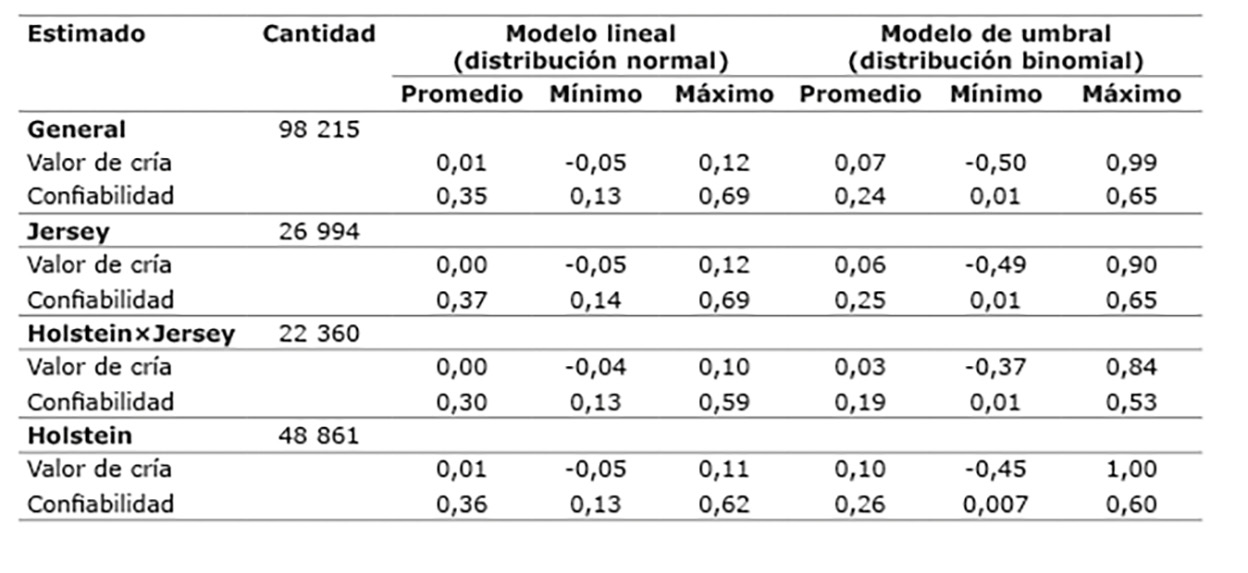 Debido a que el efecto de raza fue incluido como efecto fijo en modelo genético, los valores de cría obtenidos representan las desviaciones en propensión genética dentro del grupo racial respectivo (Cuadro 2). Las confiabilidades obtenidas fueron relativamente bajas, debido a que se trata de un evento poco frecuente. La confiabilidad varió principalmente en función del número de registros de LP y el número de partos disponibles por vaca.