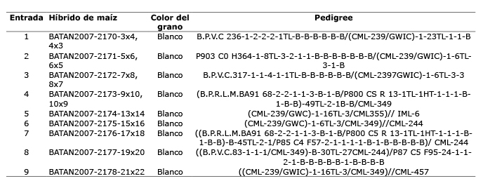 Los híbridos (Cuadro 1) corresponden al ensayo 08CHTHEW11 proporcionado por el Centro Internacional de Mejoramiento de Maíz y Trigo (CIMMYT), mientras que la variedad criolla de avena fue introducida a Costa Rica hace aproximadamente cincuenta años, la cual está bien adaptada a la zona, a partir de los 1800 m de altitud. La avena se utilizó como testigo local, debido a que los lecheros la utilizan como forraje fresco o ensilado con más frecuencia que el maíz por su alto rendimiento, producción de semilla viable, fácil manejo y corto ciclo de cosecha. Además, en la región no existe una variedad o híbrido de maíz forrajero para utilizar como referente.