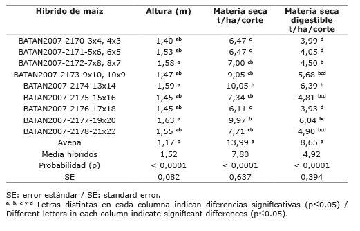 La altura de los híbridos de maíz varió entre 1,40 y 1,63 m, sin diferencias significativas (P> 0,05) entre los mismos. Sin embargo, los híbridos con código de origen BATAN2007-2172-7x8,8x7, BATAN2007-2174-13x14 y BATAN2007-2177-19x20 superaron (P<0,0001) a la avena (1,20 m) (Cuadro 2).