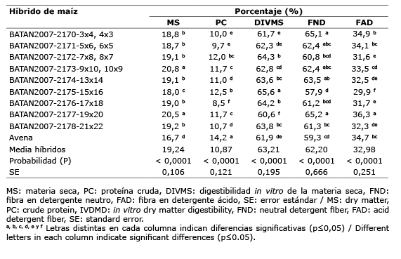 Los híbridos de maíz alcanzaron contenidos de PC entre 8,5 y 12,5%; BATAN2007-2177-19x20, BATAN2007-2172-7x8,8x7 y BATAN2007-2175-15x16 mostraron los mejores contenidos (11,7, 12,0 y 12,5%). Sin embargo, ningún híbrido superó (P<0,05) a la avena (14,2%) (Cuadro 3).