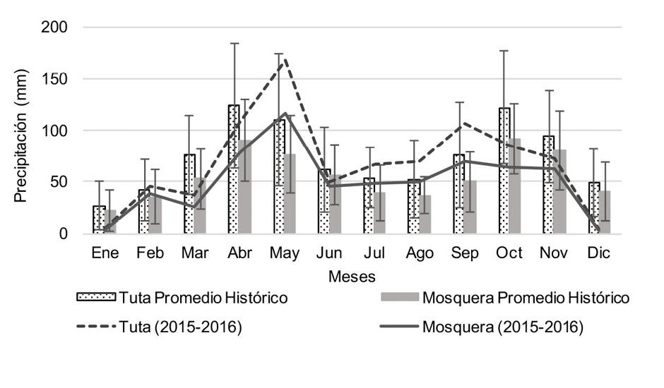 La precipitación en las regiones donde se realizó el trabajo de investigación presentaron una distribución bimodal, con dos épocas de lluvias (de marzo a junio y de septiembre a noviembre) y dos de sequía (de julio a agosto y de diciembre a febrero) (Figura 1). Mosquera presentó una menor precipitación promedio anual respecto a lo reportado en Tuta (674 vs 890 mm/año). Durante el periodo de establecimiento (noviembre a marzo) se presentó una reducción del 52% en la precipitación, mientras que en el periodo de producción (abril a julio) aumentó 10% respecto al promedio histórico (Figura 1).