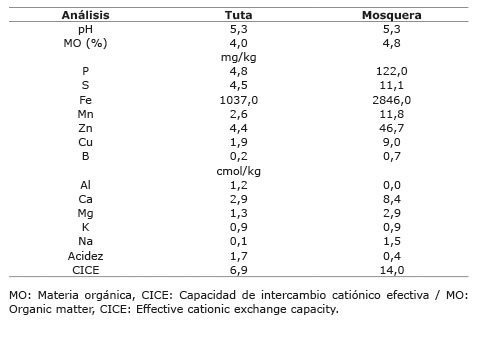 Los suelos fueron ácidos (pH<5,5) y con bajas concentraciones de materia orgánica (<5%). En Mosquera, los suelos presentaron niveles de moderados a altos de nutrientes. Sin embargo, los suelos de Tuta presentaron concentraciones de medias a moderadas de macrominerales y de medias a alta de microminerales (Cuadro 1).