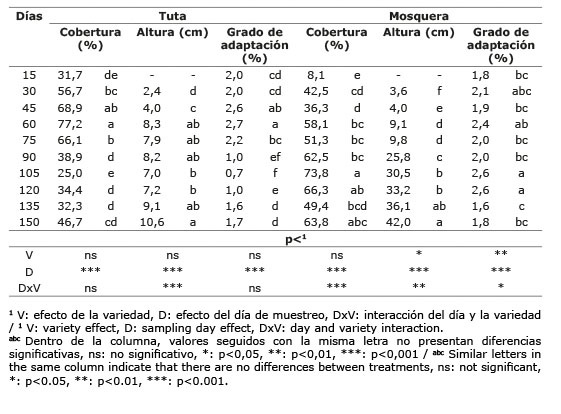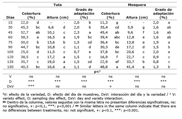 En Tuta, la altura en los tréboles presentó interacción entre la variedad y el día, debido a la mayor altura de un trébol rojo respecto al trébol blanco en los días 60, 75 y 90, respectivamente (Cuadro 3). En Mosquera las parcelas de trébol blanco desaparecieron durante el periodo de establecimiento. Los tréboles rojos presentaron la mayor cobertura y grado de adaptación al día 105 y 120, mientras que la altura y el grado de adaptación presentaron una interacción entre la variedad y el día, al evidenciar una mayor altura de uno de los tréboles rojos en el día 75.