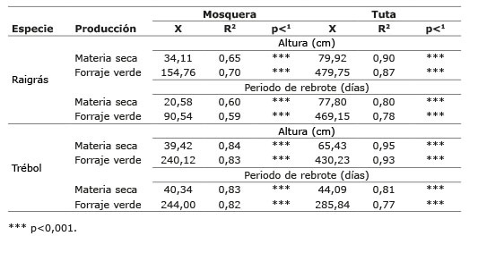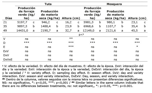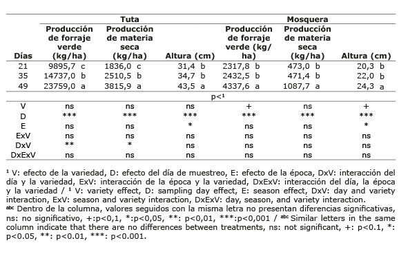Table 4. Production variables of five ryegrass (Lolium perenne), in the two regions of Tuta (Boyacá) and Mosquera (Cundinamarca), Colombia, 2015-2016.