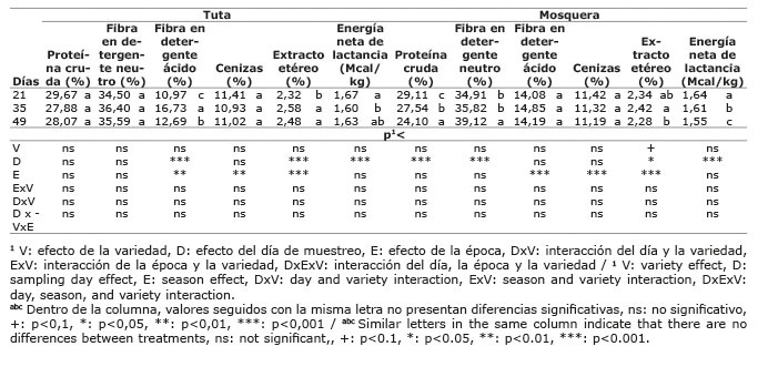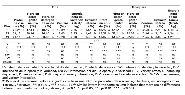 Table 5. Chemical composition of five ryegrass (Lolium perenne), in Tuta (Boyacá) and Mosquera (Cundinamarca), Colombia, 2015-2016.