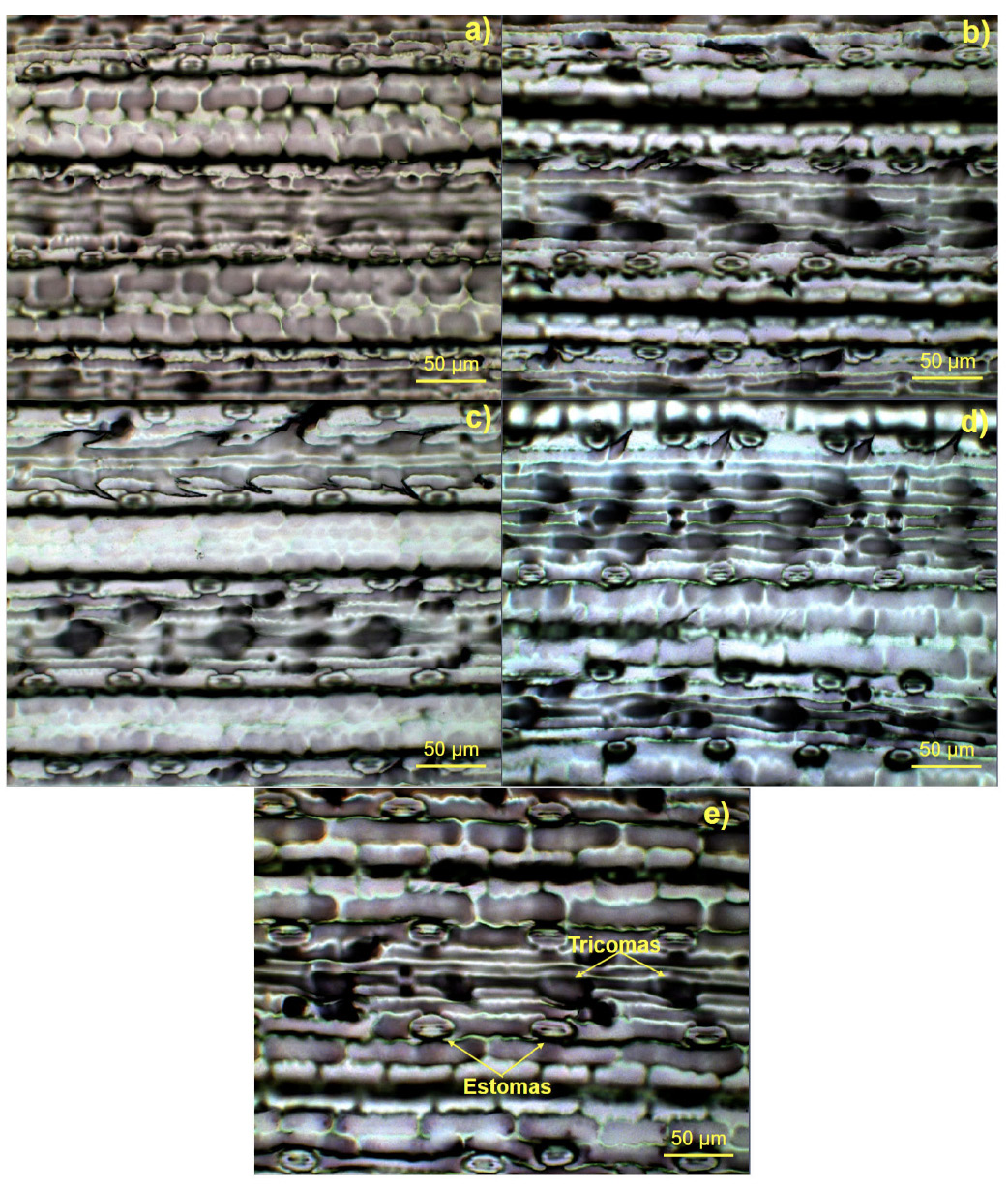 Se evaluó la densidad estomática (DE), densidad de tricomas (DT) e índice estomático (IE) por milímetro cuadrado (mm2), y el área estomática (AE) en micrómetros cuadrados (µm2). Esto se realizó en una muestra de cinco plantas de diez semanas de edad en cada genotipo, en las que, se seleccionaron tres hojas maduras de cada planta. Se obtuvo la impresión aplicando una capa de barniz o esmalte transparente de uñas en un segmento de aproximadamente 1 cm, en el sentido de las nervaduras. Este procedimiento se realizó en las superficies adaxial y abaxial, se dejó secar el barniz por 20 min hasta que se solidificó y se retiró con pinzas de disección, con cuidado de no estirar la placa de esmalte. Las muestras se colocaron sobre un porta-objetos y se cubrieron con un cubre-objetos; luego se observaron a campo claro en un microscopio óptico con un aumento de 400 diámetros (400x), y se tomaron fotografías de cinco campos ópticos de 0,0945 mm2, seleccionados al azar con una cámara, posteriormente se traspoló a 1 mm2. En cada campo óptico se contabilizó el número total de células epidérmicas (NCE), estomas y tricomas, para luego determinar la densidad por milímetro cuadrado (mm2), la DE y la DT. El área estomática (AE) se calculó con la información de tres estomas seleccionados al azar, mediante el software Zen 2 core. Con el NCE y el número de estomas (NE) se calculó el índice estomático (IE), mediante la ecuación de Salisbury (1927) indicada por Wilkinson (1979): %IE= [NE/(NCE+NE)]100. Las variables DE, IE, DT y AE se calcularon por separado para las superficies adaxial y abaxial.
