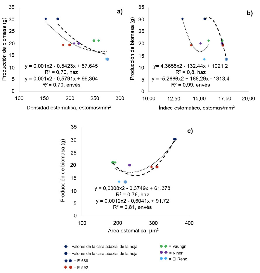 En general, las variables DE y AE no presentaron diferencias (p<0,05) entre las superficies adaxial y abaxial, pero si para IE y DT (p<0,05) (Cuadro 1). El comportamiento de la DE mostró una relación cuadrática (p<0,05) negativa con la producción de biomasa (PB), y no se presentaron diferencias (p>0,05) entre ambas superficies de la hoja. Con relación a este resultado, el genotipo con menor DE fue E-689, el cual presentó una mayor PB, mientras que, el de menor DE fue El Reno, que presentó una menor PB (Figura 2a). El IE y la PB mostraron una relación cuadrática (p<0,05) inversa, y se presentaron diferencias (p<0,05) entre las dos superficies. El genotipo con menor IE fue E-689, tanto en en la superficie adaxial como abaxial y una mayor PB, en tanto que, los genotipos con mayor IE presentaron una menor PB (p<0,05; Figura 2b).