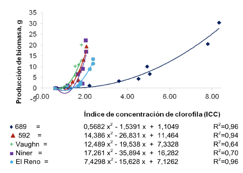 En la Figura 3 se muestra el comportamiento de la PB conforme al índice de concentración de clorofila (ICC) a través de las semanas, con una tendencia cuadrática (P<0,001) en todos los genotipos. Además, se presentaron diferencias (p<0,001) entre genotipos, y los coeficientes de determinación (R2) fluctuaron en un rango desde 0,64 hasta 0,96. El único genotipo con diferencias marcadas en el ICC fue E-689, el cual presentó los mayores valores de PB, mientras que, los demás genotipos presentaron comportamiento similar en el aumento de ICC. Por lo anterior, el ICC parece tener un efecto sobre las diferencias entre los genotipos en PB.