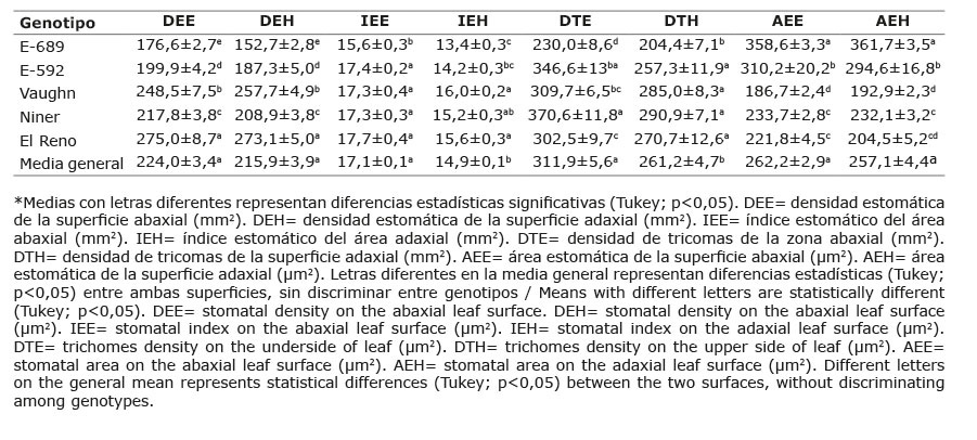 De acuerdo con el análisis estadístico para la densidad estomática (DE) de las superficies abaxial (DEE) y adaxial (DEH), se encontraron diferencias (p<0,0001) entre genotipos. Los genotipos con mayor DEE y DEH (p<0,05) fueron las variedades comerciales, mientras que, los de menor fueron los genotipos nativos (Figura 1). Respecto al índice estomático (IE), tanto en la zona abaxial (IEE) como en la adaxial (IEH), solo E-689 mostró diferencias significativas (p<0,05), al presentar los valores más bajos. Niner y E-592 presentaron mayor (p<0,05) densidad de tricomas (DT) en el envés (DTE), seguidos por Vaughn y El Reno, mientras que, E-689 presentó la menor (p<0,05) DTE. En la DT en el haz (DTH), E-689 fue el único que presentó diferencias, con la menor DTH, y mostró la mayor (p<0,05) área estomática (AE), tanto del área abaxial (AEE) como la adaxial (AEH), seguido por E-592. Los genotipos con mayor AEE y AEH fueron Niner y El Reno, mientras que, Vaughn presentó la menor AEE y AEH.