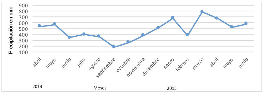 Para conocer las condiciones meteorológicas del período de desarrollo, se descargaron los registros de la estación meteorológica automática Pindo Mirador, ubicada a 33 km del sitio de ensayo, para el período comprendido entre marzo 2014 y junio 2015, se presentó una temperatura promedio entre 16 a 18 ºC, mientras que, entre abril 2014 y junio 2015 (Figura 1) los valores de precipitación más altos se reportaron en los meses de enero y marzo del 2015, y los más bajos en septiembre del 2014, para el año 2014 se reportó una media mensual de 359 mm y para el 2015 de 523 mm.