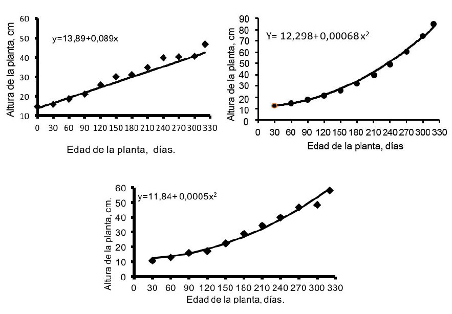 Se encontró crecimiento continuo de las plantas durante el período de evaluación (Figura 2). Los modelos matemáticos evaluados (Cuadro 2) para describir este comportamiento, mostraron su mejor ajuste en modelos lineales y polinómicos. En E. stipitata la altura se incrementó de forma constante (0,089 cm/día) (Figura 2A); la misma no presentó asíntota al final del período de evaluación, lo que indica que continuó en fase de crecimiento vegetativo.