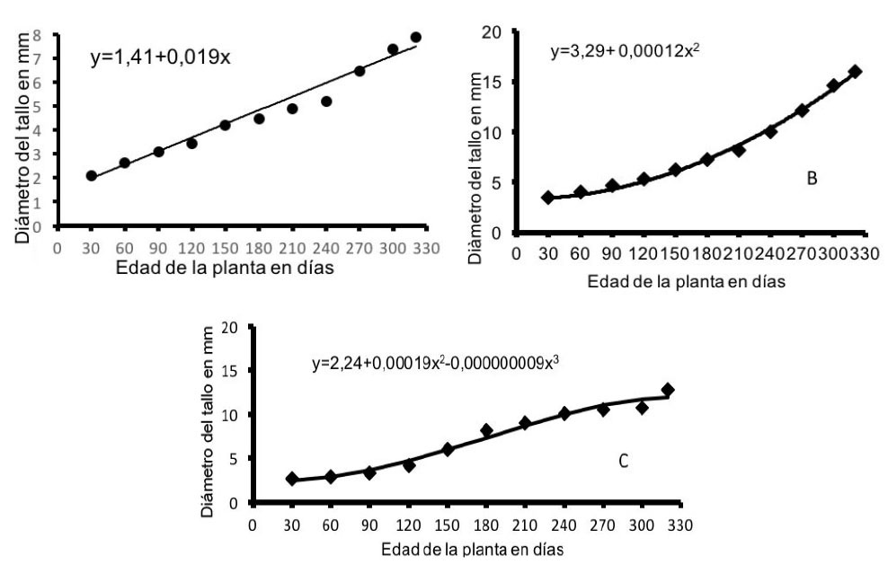 De los modelos matemáticos evaluados para el crecimiento del diámetro del tallo (Cuadro 2), E. stipitata presentó un crecimiento lineal, con una tasa de 0,089 mm/día, siendo el más lento de las tres especies (Figura 3A). En I. edulis e I. spectabilis fueron los modelos polinomiales los de mejor ajuste. En I. edulis (Figura 3C) durante los primeros 150 días fue lento, con una tasa de 0,016 mm/día, posterior a este período, aceleró su crecimiento alcanzando una tasa de 0,042 mm/día, la cual se mantuvo hasta los 240 días, a partir de los cuales alcanzó su mayor velocidad de crecimiento con una tasa de 0,062 mm/día. I. spectabilis (Figura 3B) presentó hasta los 240 días una tasa de crecimiento de 0,036 mm/día y, a partir de este período, mostró una tasa de 0,072 mm/día, siendo la etapa de desarrollo más acelerado en el diámetro del tallo. A los 320 días E. stipitata e I. spectabilis (Figura 3A y 3B) alcanzaron 7,98 y 15,81 mm de diámetro respectivamente, mientras que, I. edulis (Figura 3C) alcanzó un diámetro del tallo de 12,73 mm.