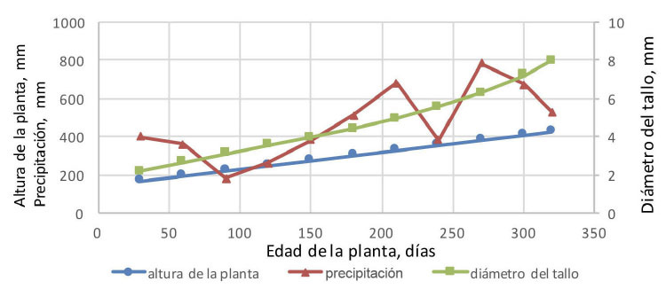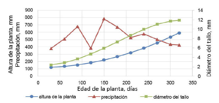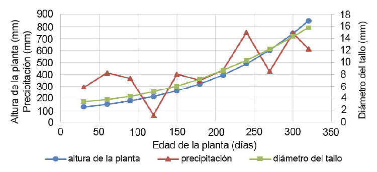 En I. spectabilis, el análisis de dos vías mostró valores significativos (p<0,001) para la altura de la planta (mm), y el diámetro del tallo (mm) (Cuadro 3, Figura 5). El mayor pico de precipitación fue a los 240 días de edad de la planta, lo cual puede influir en el incremento de la tasa de crecimiento en la altura de la planta, donde hasta los 270 días presentó una tasa de 0,23 cm/día y posteriormente, su tasa de crecimiento aumentó en un 70%, y a partir de los 300 días en un 87% con respecto a la tasa de crecimiento inicial. En el diámetro del tallo, previo a los 240 días se tuvo una tasa de crecimiento de 0,016 mm/día y posterior a este período se incrementó en un 162%. Esto puede indicar que el incremento de la precipitación tuvo incidencia en el incremento de la tasa de crecimiento para ambas medidas.