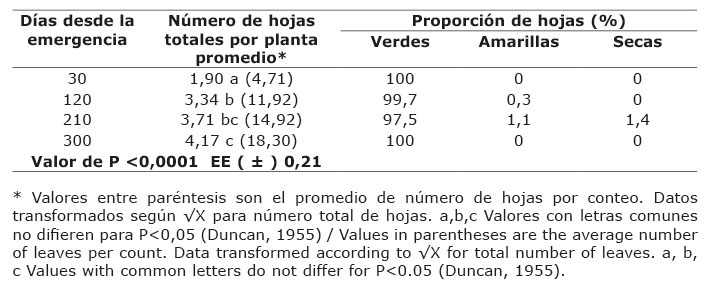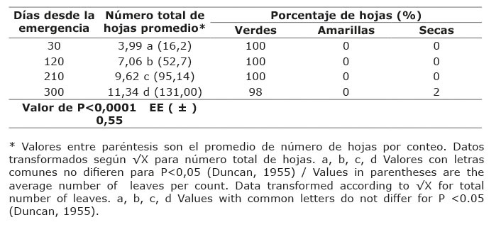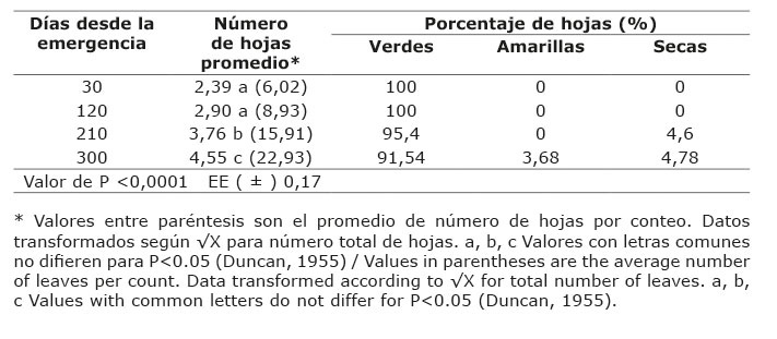 El número total de hojas (Cuadro 4), presentó cambios significativos a partir de los 30 días, al diferir todas sus medias, y su máximo fue a los 300 días con media de 131 hojas. Existió predominancia de las hojas verdes sobre las amarillas y secas.
