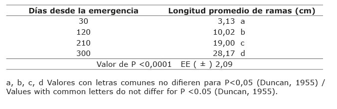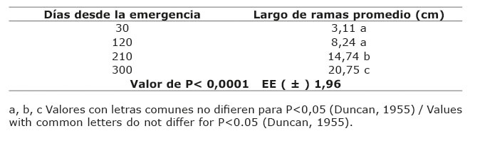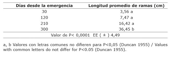 En la longitud de ramas (Cuadro 7), las yemas comenzaron a brotar a partir de los 15 días, y a los 30 días tuvieron media de 3,11 cm y presentaron diferencias a los 210 y 300 días. En la última edad de muestreo esta medida alcanzó promedio de 20,75 cm.