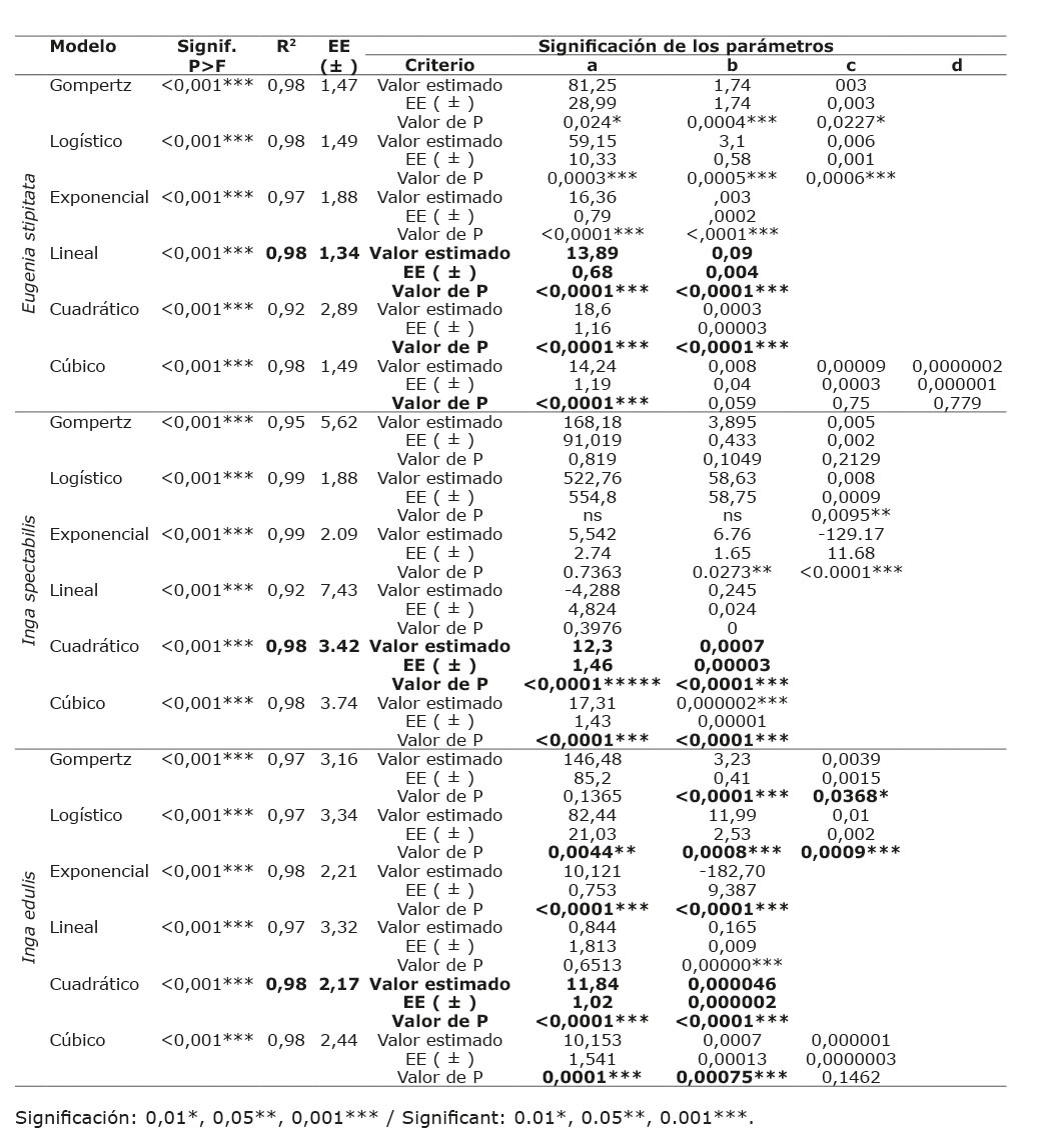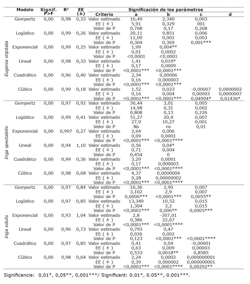 En I. spectabilis (Figura 2B), se observó una tasa de crecimiento de 0,23 cm/día, y se mantuvo hasta los 270 días, donde se incrementó a 0,39 cm/día, hasta los 300 días, para posteriormente presentar su mayor crecimiento con una tasa de 0,42 cm/día, lo cual muestra que a partir de este momento la especie entró en su etapa de desarrollo más acelerado. Si bien el modelo de mejor ajuste fue el exponencial, el parámetro “a”, presentó valores no significativos en el valor de p, por lo cual no fue considerado este modelo. En I. edulis (Figura 2C) el crecimiento fue lento, con una tasa de 0,13 cm/día, hasta los 270 días, donde incrementó a 0,26 cm/día y, a partir de los 300 días, presentó su desarrollo más acelerado con una tasa de 0,28 cm/día, alcanzando una altura máxima de 59,15 cm al final del período de evaluación sin asíntota.