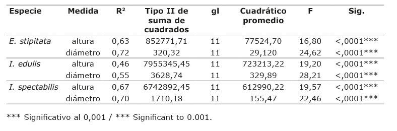 El análisis de varianza de dos vías, considerando a las variables precipitación y edad en el crecimiento de las medidas altura de la planta y diámetro del tallo (Cuadro 3), mostró valores significativos al 0,001 en todas las especies para ambas medidas, lo cual indica la incidencia de estas en el crecimiento de las especies.