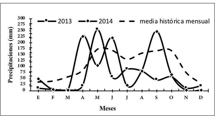 La región se clasifica como tropical relativamente húmeda (Barranco y Díaz, 1989). Con temperatura media del aire entre 24,2 (PPLL) y 27,7 ºC (PLL), con valores máximos de 28,6 (PPLL) y 32,8 ºC (PLL) (Díaz, 2007). Las precipitaciones medias fluctuaron entre 256 y 248,6 mm, para el año 2013 hasta abril de 2014. En la Figura 1 se muestra el comportamiento de las precipitaciones climáticas durante la fase de experimentación.