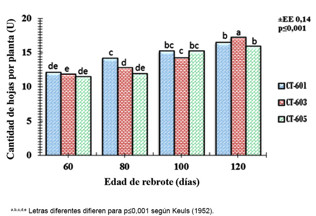 En la Figura 2 se muestra el efecto que tuvo la interacción de la edad de rebrote con variedad, sobre la cantidad de hojas por planta. Los mayores promedios se observaron a la edad de 120 días, en la variedad CT-603, este valor se diferenció (p≤0,001) del obtenido por CT-601 y CT-605, que mostraron valores semejantes, pero que difirieron significativamente (p≤0,001) con sus propios promedios y con los de CT-603 en las edades de 60, 80 y 100 días.