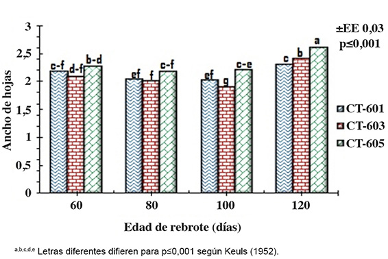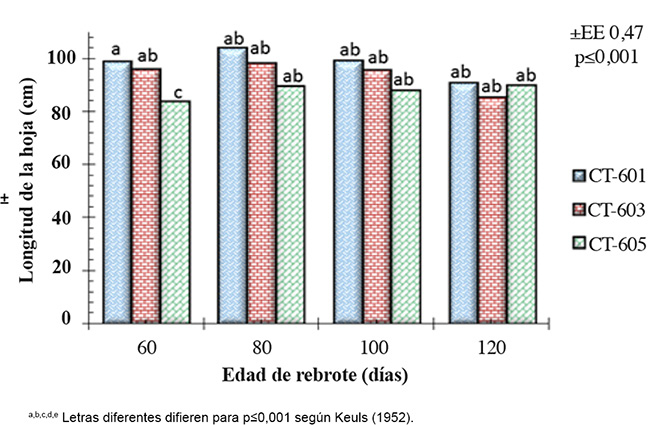 En la longitud de la hoja (Figura 3) se observó un comportamiento uniforme en función del tiempo, y común para las tres variedades; diferenciándose solamente de forma significativa (p≤0,001) los promedios de la edad de 60 días, donde CT-601 presentó la mayor longitud y CT-605 el menor valor (p≤0,001). Para el resto de las edades, los valores fueron similares y solo difirieron con sus promedios a los 60 días de rebrote.