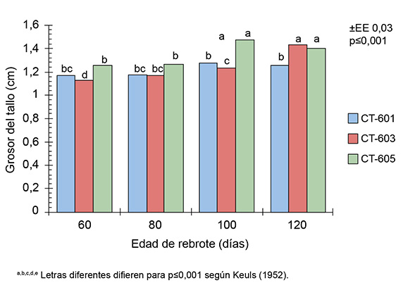 Para el grosor del tallo (Figura 5), el valor significativamente superior se obtuvo a los 100 días con CT-605, comportamiento que persistió hasta los 120 días de rebrote y se asemejó al grosor del tallo del CT-603 en esta misma edad. Estos valores difieren de los promedios obtenidos en el resto de las edades de rebrote evaluadas. CT-603 experimentó menor (p≤0,001) grosor del tallo a la edad de 60 días, a la vez que mostró variación con el resto de los valores a las diferentes edades.