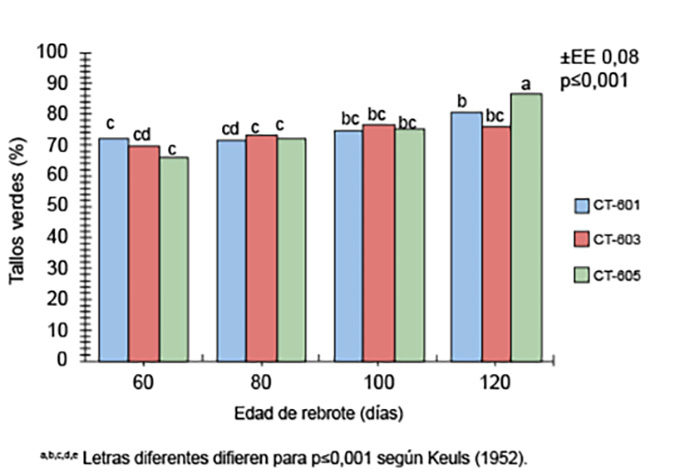 El porcentaje de tallos (Figura 6), mostró incremento con respecto a la edad de rebrote, el valor medio superior (p≤0,001) fue para CT-605 a los 120 días de edad, seguido por CT-601 a la misma edad. Sin embargo, a los 100 días todos los valores fueron similares (p≥0,05), y los resultados de CT-603 y CT-601 a las edades de 60 y 80 días, respectivamente, también coincidieron con los porcentajes mostrados en la edad de 100 días. CT-605 mostró el menor valor (p≤0,001) a la edad de 60 días, difiriendo con el resto de sus promedios y el de las variedades CT-601 y CT-605 en todas las edades de rebrote evaluadas.