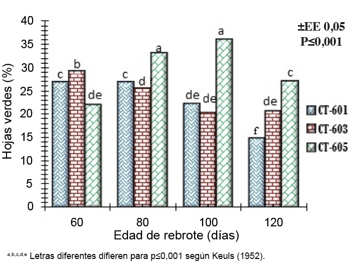El porcentaje de hojas verdes (Figura 7) disminuyó conforme avanzó la edad de rebrote, pero CT-605 a los 80 y 100 días de rebrote mostró las mayores (p≤0,001) medias que, difirieron a su vez de sus promedios para las edades de 60 y 120 días, y estos últimos, no fueron comunes entre sí. El valor más bajo (p≤0,001) lo presentó CT-601 a los 120 días, el cual difirió significativamente (p≤0,001) con los de CT-603 y CT-605 en todas las edades, tampoco fue común a los valores de sí mismo en las demás edades.
