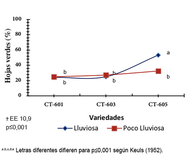 El efecto de la interacción estación climática con variedad, también provocó modificaciones en el porcentaje de hojas y tallos verdes (Figuras 8 y 9). Las variedades CT-601 y CT-603 tuvieron un comportamiento similar en lo referente al acúmulo de hojas y tallos en ambas estaciones climáticas, estos resultados difirieron (p≤0,001) con los valores de CT-605 en ambos periodos. En el porcentaje de hojas verdes de CT-605 en las lluvias, presentó el mayor (p≤0,001) valor para esta variable. Sin embargo, el promedio en la estación poco lluviosa no difirió del manifestado por las variedades en estudio, pero sí fue diferente (p≤0,001) del valor obtenido en la lluvia por esta misma variedad (CT-605).