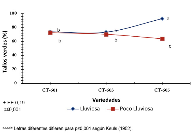 Para los tallos se acumuló mayor porcentaje que para las hojas, y ocurrió un comportamiento semejante al que se describió para el efecto de la interacción en el porcentaje de hojas verdes, solo que, para la estación de pocas lluvias, CT-605 presentó el menor valor (p≤0,001), el cual difirió del promedio obtenido en las lluvias por esta misma variedad y con el resto de los promedios en ambas estaciones climáticas. El promedio obtenido en las lluvias por CT-605, fue significativamente superior al resto de los valores aportados por las variedades CT-601 y CT-603 en las dos estaciones climáticas.