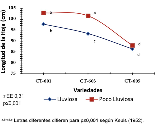 La longitud de la hoja también fue afectada por el efecto de la interacción en estudio, y se observó (Figura 10) que, el CT-601 y CT-603 mostraron los mismos superíndices en la estación lluviosa, y difirieron de sus propios promedios y de los del CT-605, quien en ambos períodos climáticos presentó los valores significativamente inferiores.