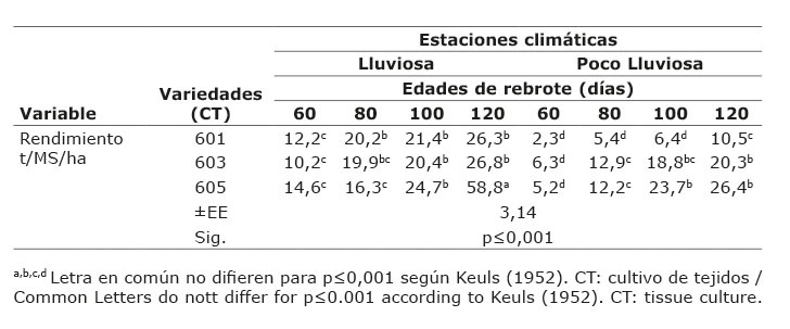 El rendimiento promedio de CT-603 a los 100 días en la época poco lluviosa, fue similar a los valores de 80 y 120 días en este mismo período climático, y común para los valores de rendimientos alcanzados en el PLL, el valor más deprimido (p≤0,001) con respecto al resto de los promedios se obtuvo a la edad de 60 días en el PPLL. Para la variedad CT-605, el promedio logrado a los 120 días en la época lluviosa difirió (p≤0,001) del resto de los promedios en ambas épocas climáticas, sin embargo, en el resto de las edades en ambas épocas solo fueron comunes los valores a los 60 días de rebrote