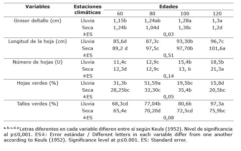 Al interactuar estación climática con la edad de rebrote se afectaron varias variables agronómicas (Cuadro 3). De esta manera, el grosor de los tallos se redujo considerablemente en la época poco lluviosa, el menor registro (p≤0,001) se obtuvo a los 100 días, mientras que, los promedios de las edades 80 y 120 días fueron comunes, el comportamiento de esta variable en la época lluviosa, fue significativamente superior a la época poco lluviosa.