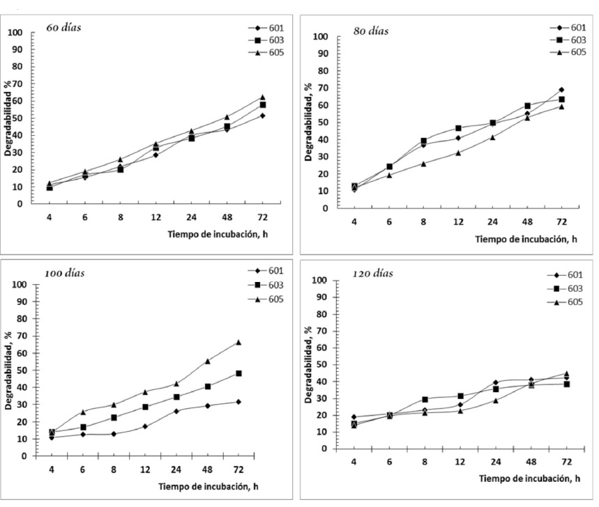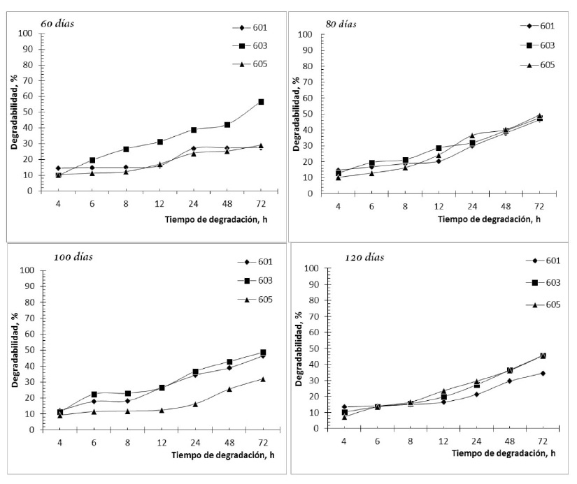 Lo expuesto acerca del efecto de la edad de rebrote con respecto a la degradabilidad, no coincide con el criterio de Cáceres (1985), quien refirió que no siempre el valor nutritivo de un pasto se reduce conforme avanza la edad, sino que intervienen otros factores; sin embargo, no lo demostró en el estudio que desarrolló. Este criterio coincidió con el expuesto por Benavides (1977), quien tras evaluar al pasto kikuyo (Pennisetum clandestinum) bajo diferentes edades de corte, concluyó que la madurez en este tipo de pasto no presenta gran influencia en el valor nutritivo, debido seguramente, a las características climáticas de la región donde se desarrolló su experimento. Las condiciones climáticas en que se desarrollaron las plantas en estudio, pudieron estimular el fortalecimiento de los enlaces covalentes que se establecen entre los polímeros de la pared celular, la lignina y los carbohidratos estructurales, con tendencia a incrementar la polimerización y ramificación de los constituyentes estructurales (Hernández, 1999), lo que estimula y acelera las modificaciones en la organización molecular de las membranas de la célula y en su pared celular (Fortes, 2014).