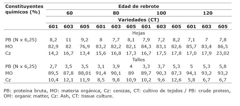 El análisis de las muestras de las variedades se realizó en hojas y tallos. Se determinó el contenido de MO, proteína bruta (PB) y cenizas (Cz), de acuerdo con las técnicas descritas por AOAC (2016). En el Cuadro 1 se describe la composición química de las variedades en diferentes edades de rebrote.