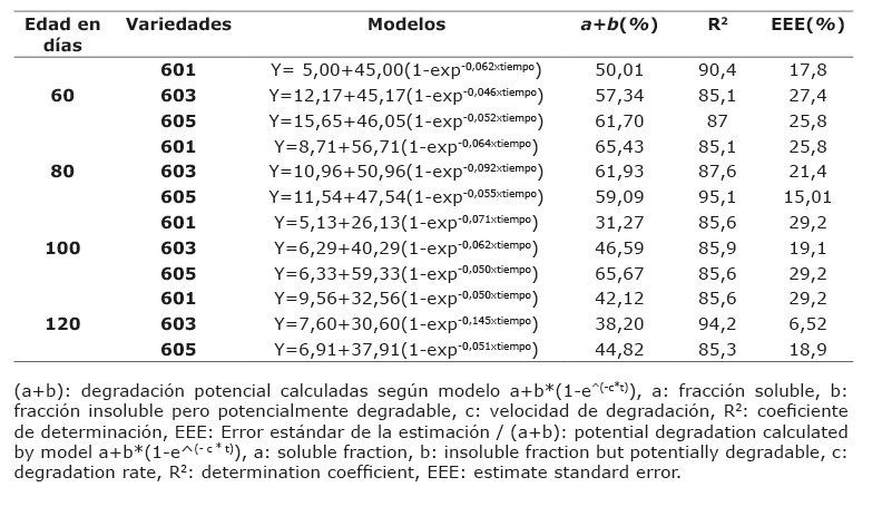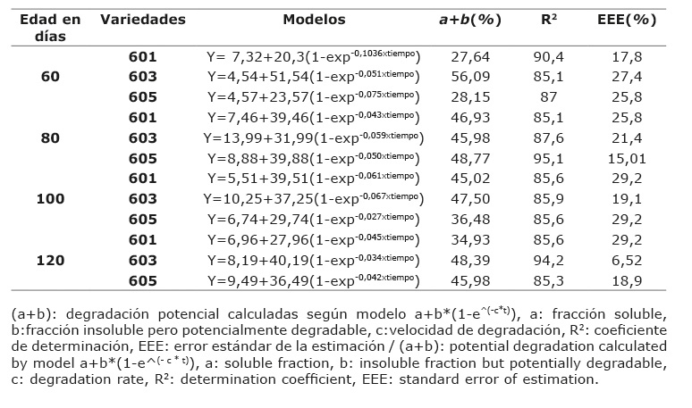 Cuando se analizaron los parámetros que componen la degradabilidad ruminal in situ de la MO en hojas, se observó el paulatino deterioro de la degradación en función del incremento de la edad de rebrote.