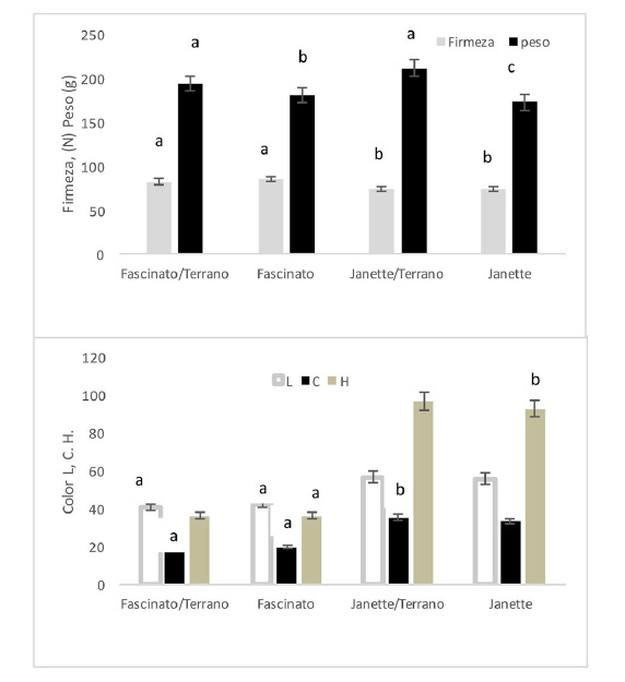 La calidad de la fruta se puede determinar en términos de apariencia, firmeza, textura, sabor y compuestos relacionados con la salud (Rouphael et al., 2010). En los resultados para calidad, existieron diferencias significativas en las variables evaluadas, sin embargo, los tratamientos que presentaron mayor firmeza fueron Fascinato/Terrano y Fascinato sin injertar (Figura 1). Las variedades Fascinato/Terrano y Janette/Terrano, presentaron incremento en el peso.