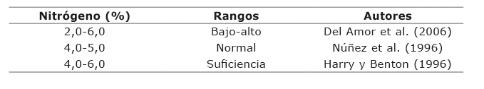 La concentración de nitrógeno en hoja suele variar del 2% al 6% en peso seco, y está correlacionada con la capacidad fotosintética y productividad del cultivo, además, desde el punto de vista metabólico refleja el estado nutricional (Del-Amor et al., 2006). Los valores obtenidos en este trabajo en la variedad Janette/Terrano llegaron al 4%, presentando un rango de suficiencia de acuerdo con diversos autores (Cuadro 2), lo que puede indicar que, hubo una mayor intensidad de absorción de la molécula de clorofila, ya que el N es el principal componente de esta (Taiz y Zeiger, 1998). El empleo de portainjertos puede mejorar algunas características morfológicas y/o fisiológicas para aumentar la absorción de nutrientes del suelo y su translocación a las hojas (Ruiz et al. 1996). Por otra parte, Ramírez (2000) reportó que el contenido de azufre se encuentra en el rango de 0,3- 0,6, y los obtenidos en este estudio en la variedad Janet mostraron valores de 0,46 y en injerto de 0,49, los cuales se vieron influenciados por el injerto al incrementar el contenido de azufre en hoja. Por lo tanto, el efecto del injerto puede influir de manera positiva en la acumulación de nitrógeno y proteína en los tejidos de hoja, la asimilación del nitrógeno implica procesos interdependientes estrechamente regulados en la planta, que son un requisito básico para el éxito continuo del injerto (Rouphael et al., 2010).