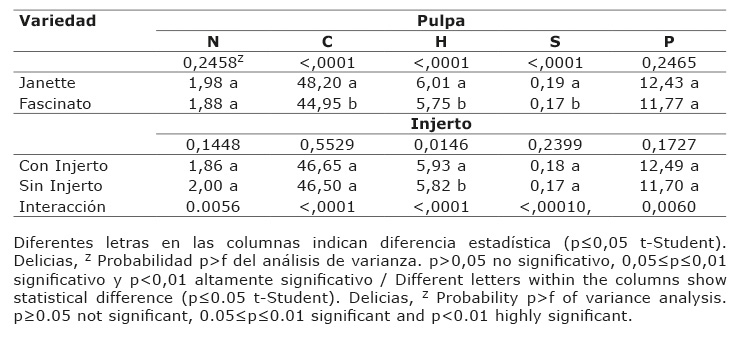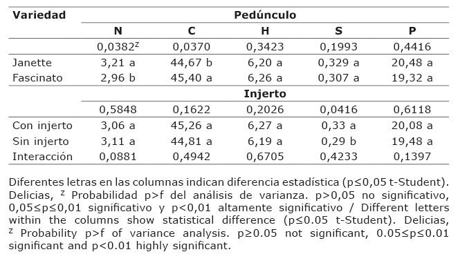 En el Cuadro 3, se muestran los datos obtenidos en N, C, H, S y proteína, en pedúnculo, los cuales no mostraron diferencias significativas entre tratamientos (p≤0,05). La variedad Janette fue significativa en el contenido de N en el pedúnculo, y la variedad Fascinato presentó el valor más alto en C, a diferencia del H, S y proteína. En relación con el injerto no hubo diferencias en las variables de C, H, S y proteína. Se menciona que los frutos son los principales órganos sumidero de asimilados, el peso acumulado de los frutos representa entre el 50 y 60% del peso seco total (Peil y Gálvez, 2005), sin embargo, la distribución momentánea del incremento de la materia seca entre los frutos y parte vegetativa puede cambiar de manera cíclica, el cual parece mantener una relación lineal con el peso total de la planta.