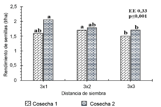 Un comportamiento diferente se obtuvo al evaluar el comportamiento del rendimiento de semillas por cosecha en función de la densidad de siembra (Figura 1). En la primera cosecha el rendimiento de semilla en las distancias de siembra 3x2 y 3x3 difirieron (p≤0,05) entre sí, mientras que, 3x1 fue común para ambos marcos de siembra. Este resultado sugiere un efecto significativo en función de la distancia de siembra que favorece el rendimiento de semilla, sin embargo, el marco de plantación 3x1 en la segunda cosecha favoreció que se incrementara de forma significativa el rendimiento con respecto al marco 3x3, en esta ocasión el rendimiento de semillas para el marco 3x2 se comportó de forma estable.