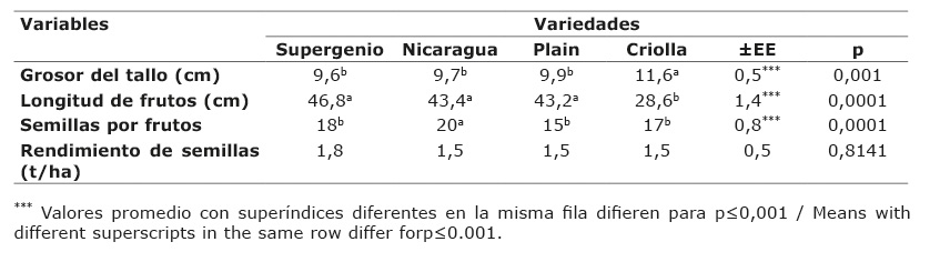 En el tamaño de los frutos (Cuadro 1), la variedad Criolla mostró la menor longitud, 28,6 cm de valor medio, el resto de las variedades no mostraron diferencias significativas (p≥0,05), y la longitud media de los frutos sobrepasó los 40 cm, referido este valor por Ramos et al. (2010), como máximo en el largo de los frutos. Sin embargo, la cantidad de semillas por frutos, varió entre 15 y 20 para todas las variedades (variedad Nicaragua con 20), valores que coincidieron con los rangos referidos en la literatura (Ramos et al., 2010) al caracterizar este cultivo, y con los obtenidos por Gonzalo (2016) al evaluar la producción de semilla en dos condiciones de manejo y variantes de asociación de plantación.