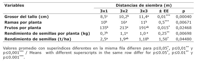 En el rendimiento de semillas (t/ha), el marco de plantación 3x1 resultó ser significativamente superior al resto de los marcos estudiados. Estructuralmente, las plantas en esta densidad de siembra no mostraron un desarrollo favorable por la alta densidad de plantación, pero el peso específico de las semillas fue mayor, por lo que, se considera que es un efecto en el que se debe profundizar.