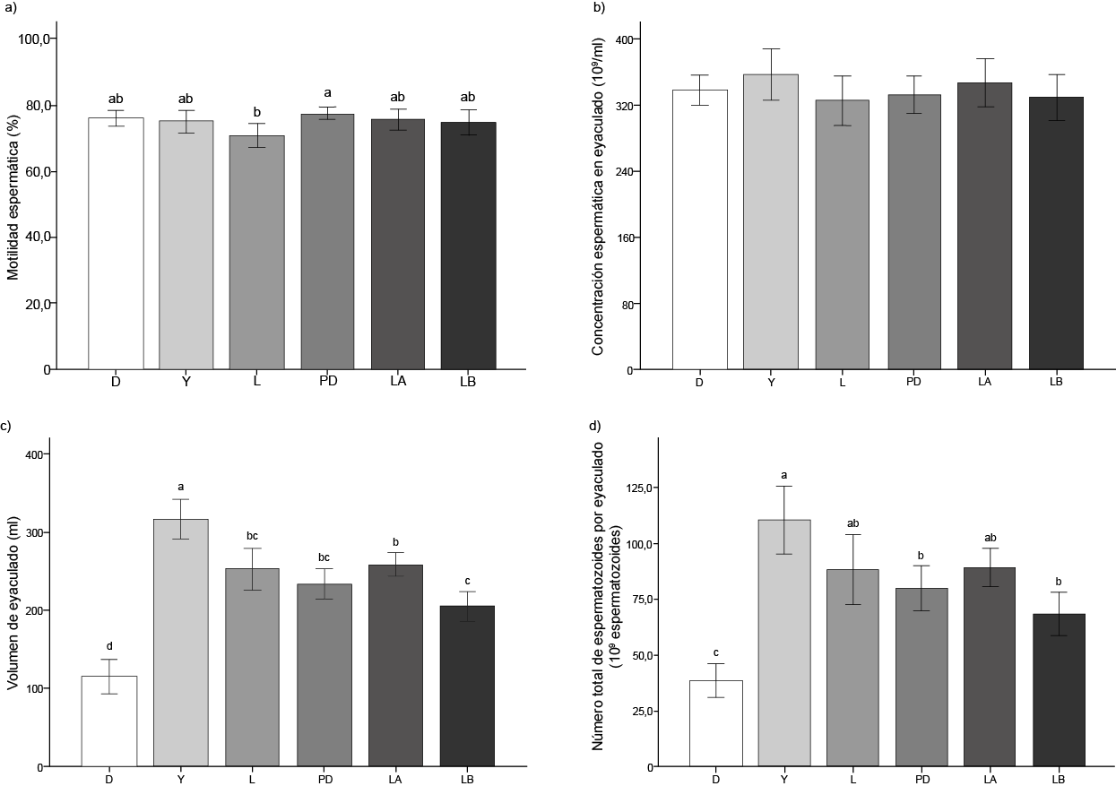 Los resultados de la motilidad total, la concentración espermática, el volumen del eyaculado y el número total de espermatozoides por eyaculado de los verracos de las diferentes razas o líneas genéticas, se muestran en la Figura 1. La motilidad total fue estadísticamente diferente (P<0,05) entre los grupos raciales Landrace y F1 Pietrain*Duroc. El volumen de eyaculado fue la variable que mostró más diferencia entre grupos (P<0,05), especialmente entre los verracos de las razas Yorkshire, línea A, línea B y Landrace, en orden decreciente. Además, el análisis estadístico indicó que, no había diferencias significativas en la concentración de espermatozoides entre los verracos de diferentes grupos raciales (P>0,05). Los verracos de la raza Duroc presentaron un menor número total de espermatozoides con respecto a los demás grupos raciales, mientras que, los verracos de la raza Yorkshire presentaron mayor número total de espermatoides en relación con los verracos de la Línea B y los machos F1 Pietrain*Duroc (P<0,05; Figura 1).