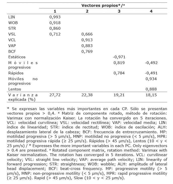 Se realizó análisis multivariante con el propósito de identificar subpoblaciones de espermatozoides del conjunto completo de datos de movilidad. El primer paso fue realizar un análisis de componentes principales (PCA). Para seleccionar el número de componentes principales a utilizar en el próximo paso del análisis, se siguió el criterio de seleccionar solo aquellos con un valor propio (varianza extraída para ese componente principal particular) >1 (criterio de Kaiser). Además, se comprobó la factibilidad del análisis factorial (AF), mediante la prueba de esfericidad de Bartlett para contrastar la hipótesis nula, de que la matriz de correlaciones es una matriz identidad, y el índice KMO (Kaiser-Meyer-Olkin), determina el cálculo de las correlaciones entre dos variables una vez eliminada la influencia que las restantes variables ejercen sobre ellas e indica la conveniencia de realizar el AF.