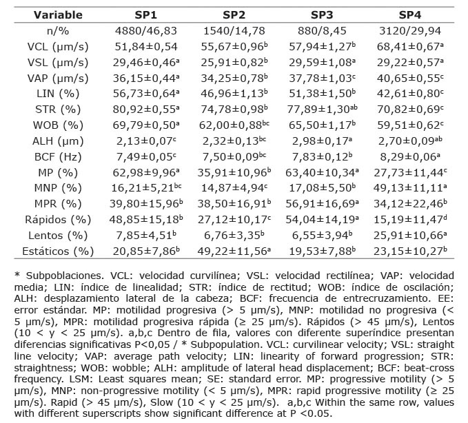 La subpoblación 1: constituida por espermatozoides con una velocidad moderada, con VCL =51,84±6,94 μm/s, VSL =29,46±6,64 μm/s y VAP =56,73±9,66 μm/s, pero de trayectoria progresiva (LIN =56,73±9,66%; STR =80,92±6,75%; ALH =2,13±0,28 μm; y BCF =7,49±0,56 Hz, MP =62,98±9,96%). Del total de los espermatozoides, el 46,83% fueron asignados a esta subpoblación. La subpoblación 2 estuvo representada por espermatozoides con un movimiento activo, pero no progresivo, reflejado por valores altos de VCL=55,67±9,91 μm/s y ALH= 2,32±0,33 μm, y bajos de LIN (46,95±12,38%), STR (74,78±9,96%) y MP (35,91±10,96%). Además, en esta subpoblación se encontró el mayor porcentaje de espermatozoides estáticos (49,22±11,56%). El 14,78% del total de espermatozoides formó parte de este grupo (Cuadro 10). La subpoblación 3 presentó la menor cantidad de células con un 8,45%; las cuales mostraron una velocidad baja, caracterizada principalmente por mostrar VAP =37,78±7,88 μm/s, VCL =57,94±11,27 μm/s, VSL =29,59±7,56 μm/s y trayectoria progresiva (LIN =51,38±10,37%; STR =77,89±7,60%; WOB =65,50±8,02%; MP =63,40±10,34%; MPR =56,91±16,69%). La subpoblación 4 estuvo representada por el 29,94% de la población total, incluyó aquellos espermatozoides con movimiento más rápido pero no progresivo, indicado por los valores más elevados de VCL (68,41±8,71 μm/s), VSL (29,22±7,52 μm/s), VAP (40,65±6,83 μm/s) y BCF (8,29±0,94 Hz), junto con una baja LIN (42,61±8,87%), STR (70,82±10,63%), WOB (59,51±6,74%), MP (27,73±11,44), MNP (49,13±11,11) y moderada ALH (2,70±0,32 μm) (Cuadro 10).